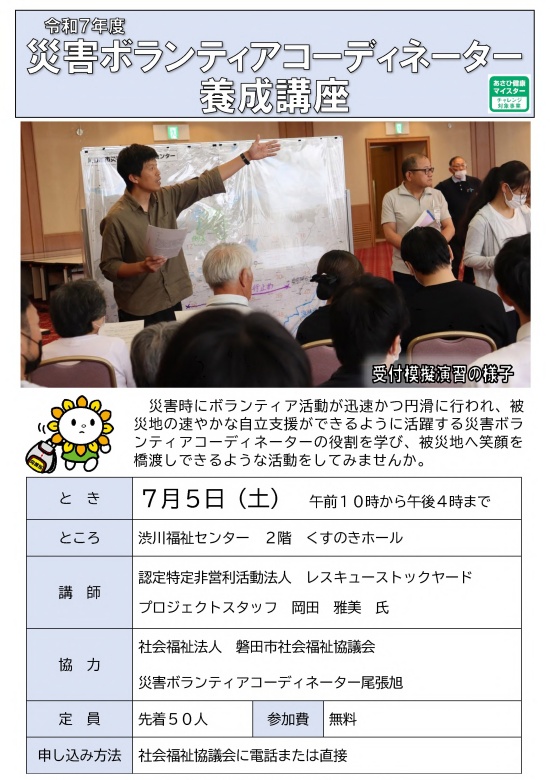 7月5日(土)に、64人の参加者を得て、令和7年度災害ボランティアコーディネーター養成講座を開催しました。