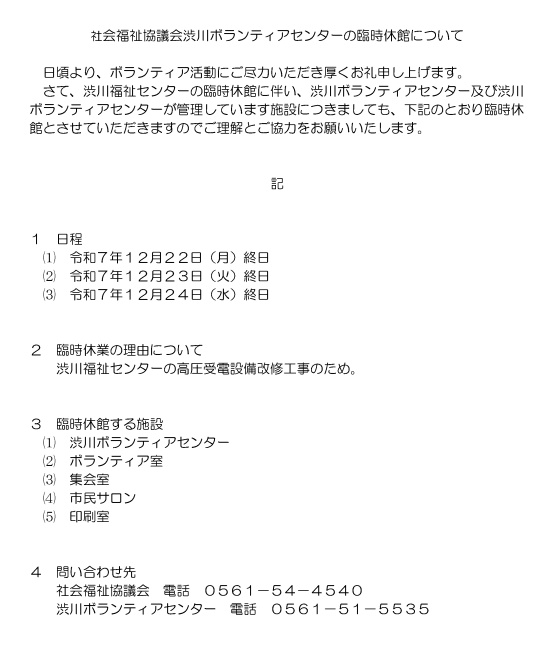 社会福祉協議会渋川ボランティアセンターの臨時休館について